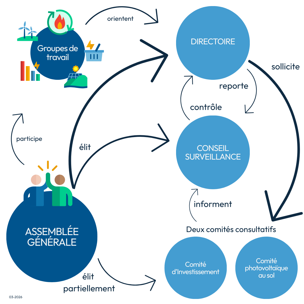 Lors de l’AG de mai 2025, les statuts de notre coopérative ont évolué. Ainsi, le Collège B « EPCI » devient « Collectivités territoriales et assimilées ». En pratique le directoire a souhaité renforcer le lien entre la coopérative et les communes, qui sont par essence les premières concernées par l’implantation des projets d’énergies renouvelables.